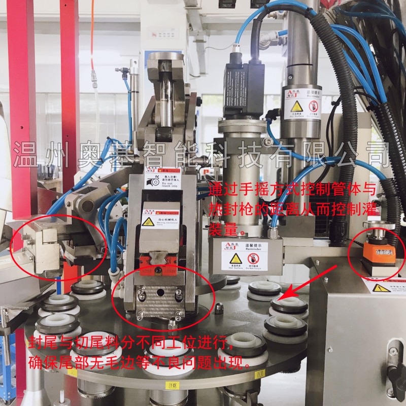 用于企业产品选以塑料软管为包装容器,该设备可将油膏、乳膏、凝胶剂或粘度流体等物料灌装之软管内部,