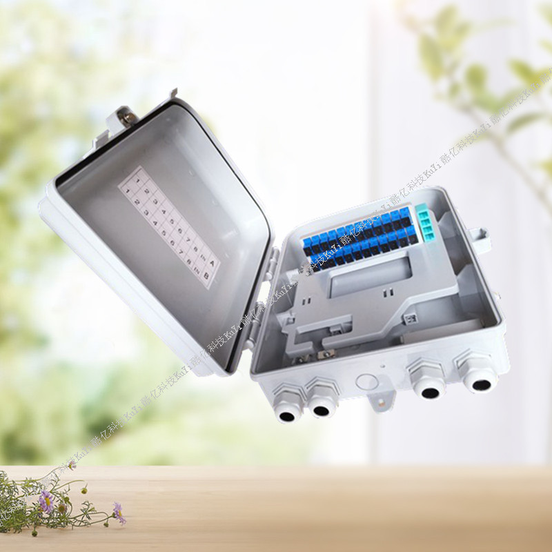 光纤分纤箱适用遇FTTH网络电信网络数据通信网络局域网等,产品由工程塑料注塑成型,能容纳安装36芯皮线光缆,具有防紫外线冲击防水等功能,有2根光缆人口和2根光缆出口,可壁挂和抱杆安装。